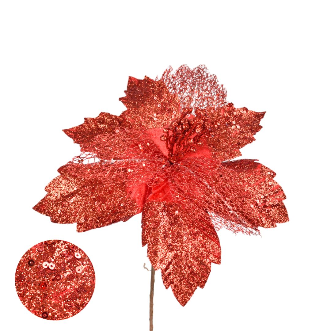 La Flor Navideña de 25 cm es perfecta para realzar la decoración de tus espacios en esta temporada festiva. Su tamaño destacado permite una presencia elegante y llamativa, ideal para complementar arreglos navideños, coronas, centros de mesa y arboles de navidad. Con un diseño pensado para reflejar la tradición y el espíritu de la Navidad, esta flor agrega calidez y estilo a cualquier ambiente.