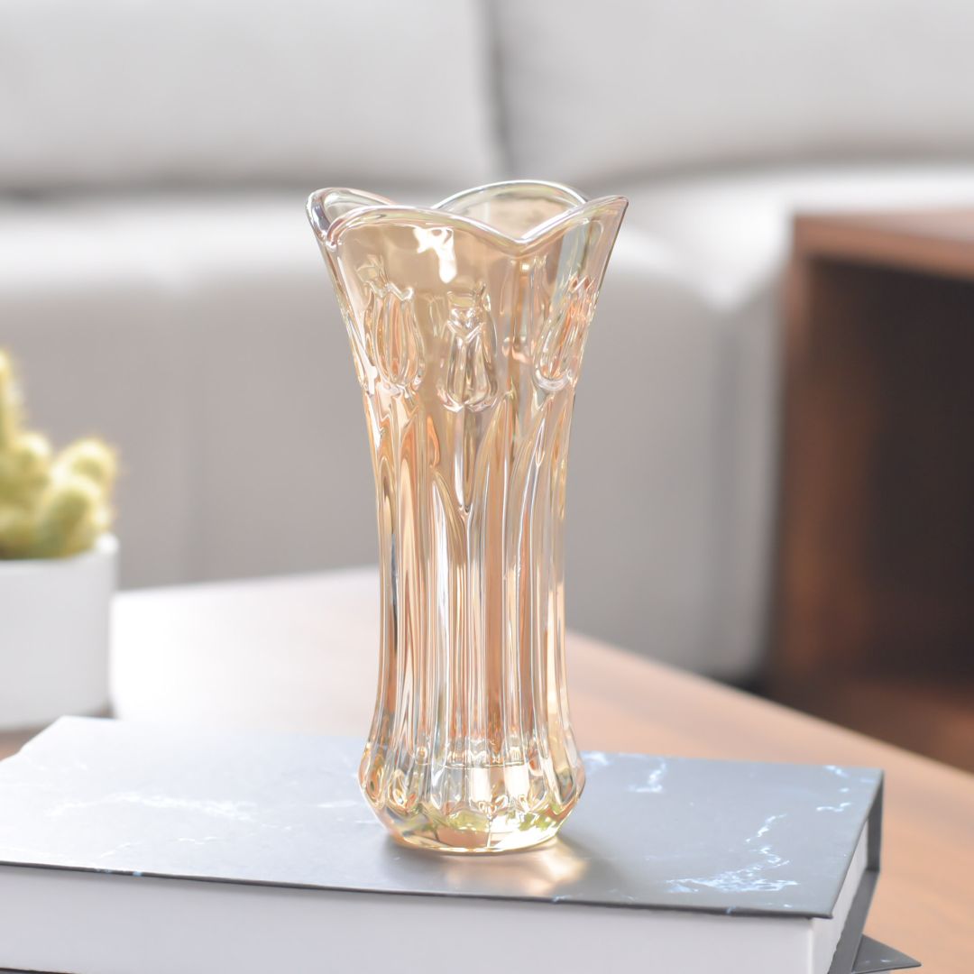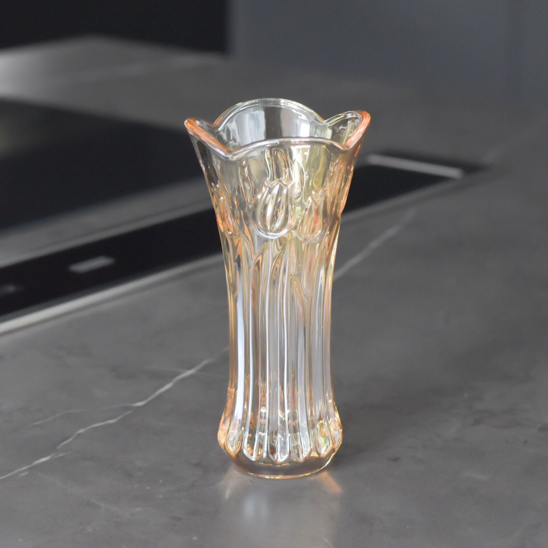 Jarrón en cristal ámbar con un diseño elegante y sofisticado que transforma cualquier espacio en un ambiente refinado. Sus dimensiones de 19x9 cm lo hacen perfecto para exhibir flores frescas o como pieza decorativa independiente. La tonalidad ámbar cálida añade carácter y luminosidad a salas, comedores y recámaras. Una opción versátil para quienes buscan decoración de calidad que combine funcionalidad y estética.