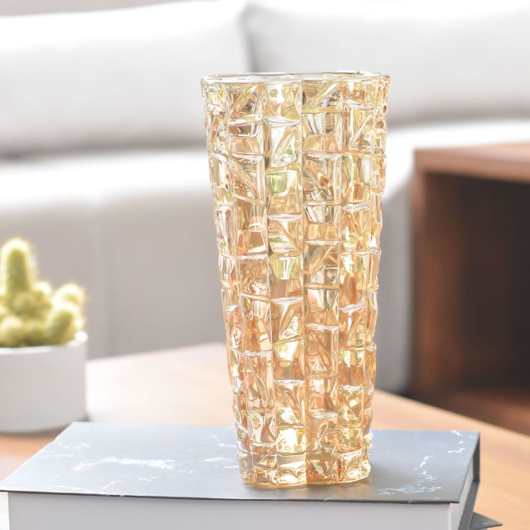Jarrón en cristal ámbar con un diseño elegante y sofisticado que transforma cualquier espacio en un ambiente refinado. Sus dimensiones de 24x11 cm lo hacen perfecto para exhibir flores frescas o como pieza decorativa independiente. La tonalidad ámbar cálida añade carácter y luminosidad a salas, comedores y recámaras. Una opción versátil para quienes buscan decoración de calidad que combine funcionalidad y estética.