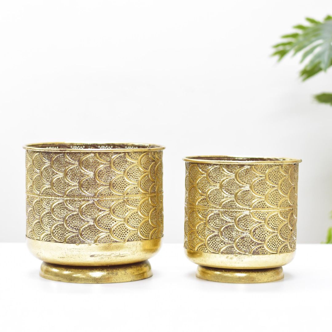 Este set de 2 macetas de 23x25 cm, fabricadas en latón, es perfecto para exhibir tus plantas favoritas y transformar cualquier espacio con un toque sofisticado. Su material garantiza durabilidad y un acabado elegante, ideal tanto para interiores como para exteriores. Con estas macetas, lograrás una decoración armoniosa y resistente que realza la belleza natural de tus plantas.