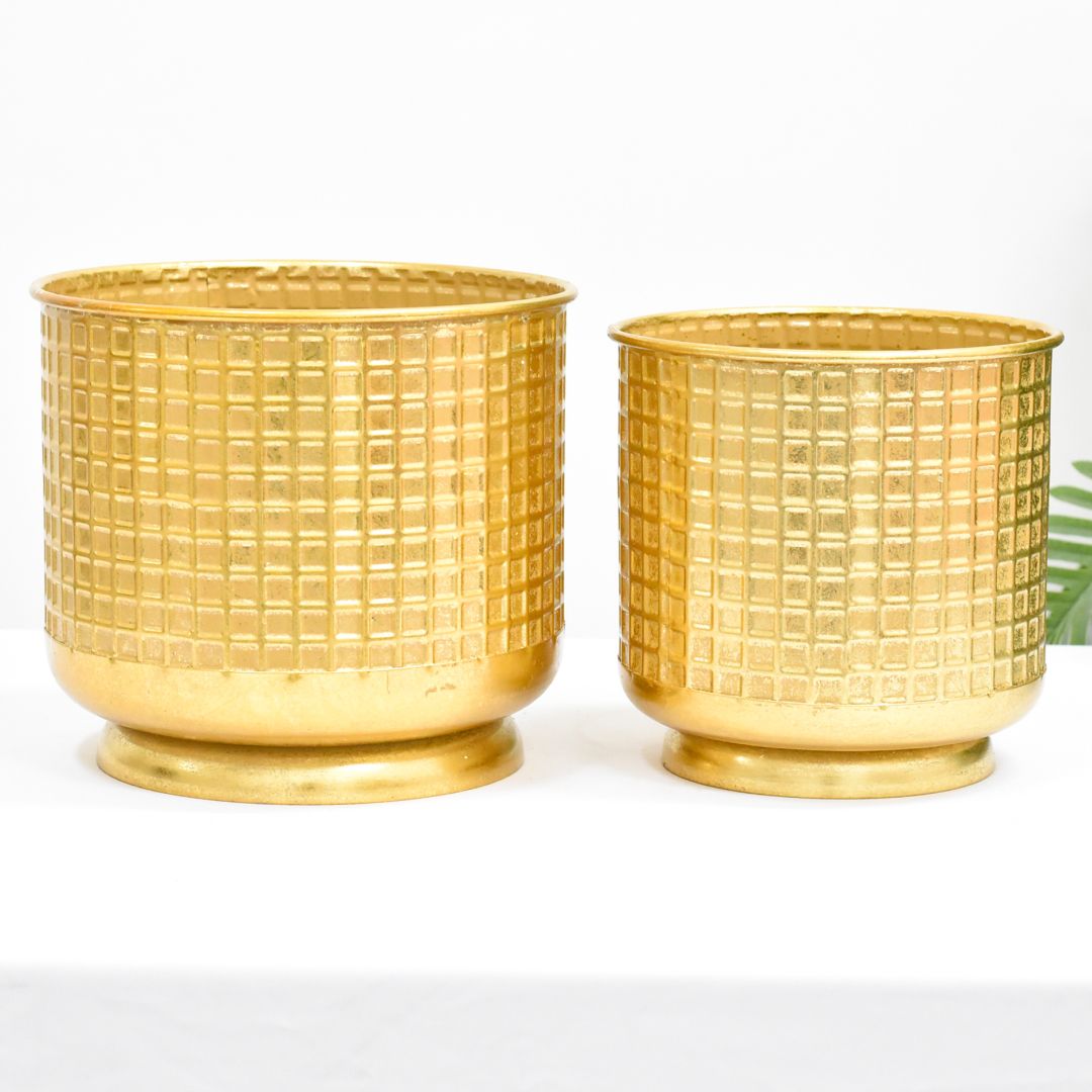 Este set de 2 macetas de 25x22 cm, fabricadas en latón, es perfecto para exhibir tus plantas favoritas y transformar cualquier espacio con un toque sofisticado. Su material garantiza durabilidad y un acabado elegante, ideal tanto para interiores como para exteriores. Con estas macetas, lograrás una decoración armoniosa y resistente que realza la belleza natural de tus plantas.